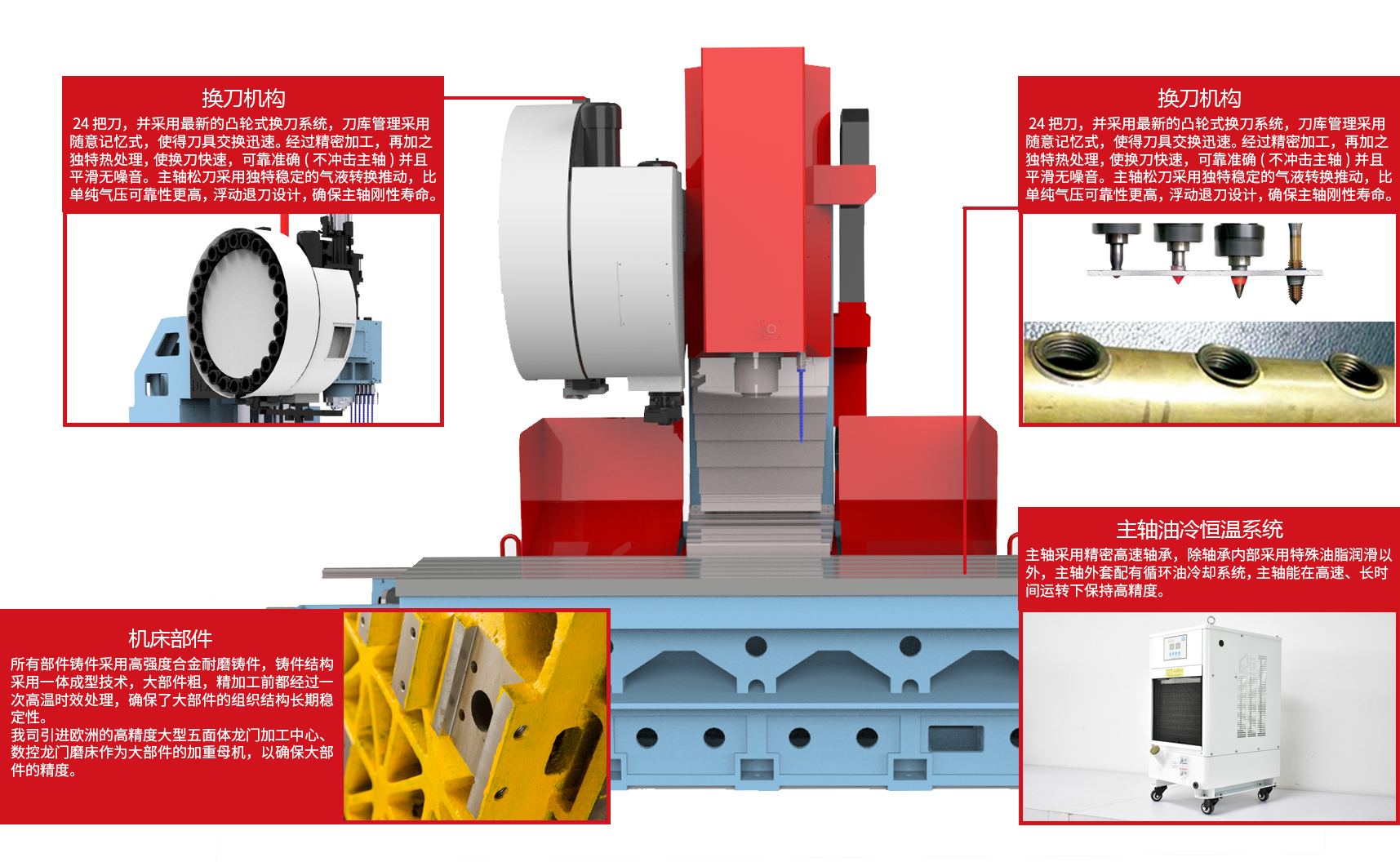 24 把刀,并采用最新的凸轮式换刀系统,刀库管理采用随意记忆式,使得刀具交换迅速。 经过精密加工,再加之独特热处理, 使换刀快速,可靠准确(不冲击主轴)并且平滑无噪音。主轴松刀采用独特稳定的气液转换推动,比单纯气压可靠性更高,浮动退刀设计,确保主轴刚性寿命。